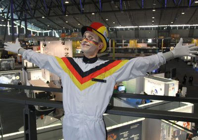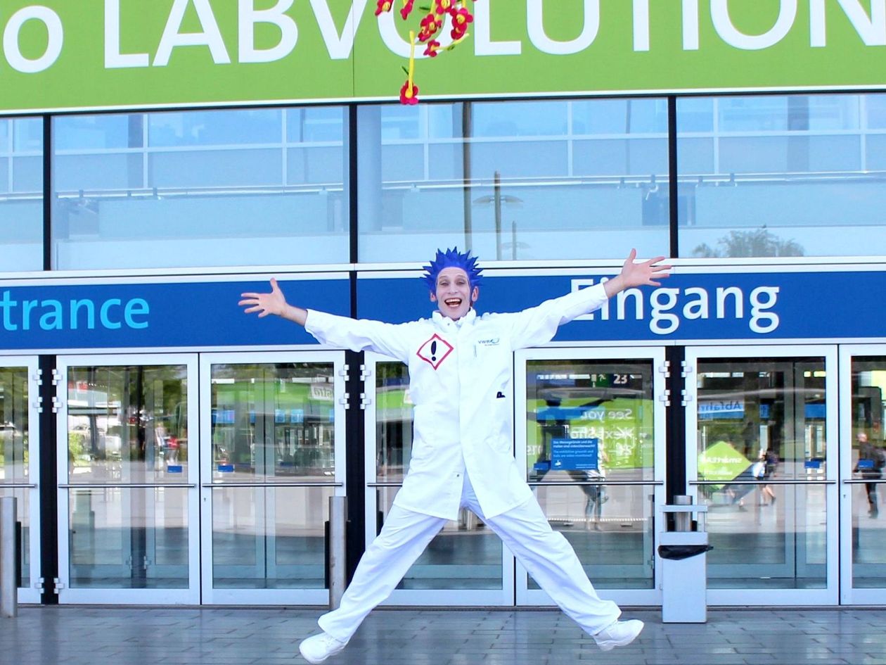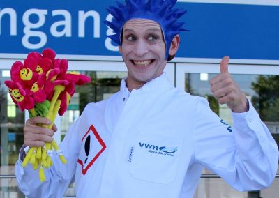 Auf der Messe Analytica 2016 war beispielsweise ein ganz besonderer Walk-Act geplant. Dafür war ich, zusammen mit vier weiteren Pantomimen, als Laborant der Firma verkleidet. Mit wilder, blauer Perücke und in weißem Laborkittel waren wir nicht zu übersehen.